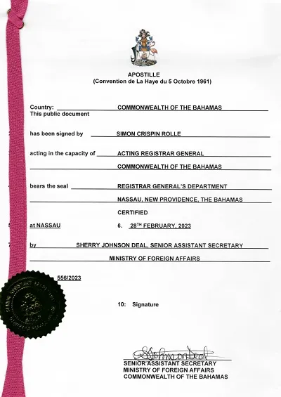 Legal documents to be used internationally like Powers of Attorney, Certificates of Incorporation, Articles of Associations, Marriage, Birth Certificates and others require an Apostille Seal from the consular division of the Bahamas Ministry of Foreign Affairs in order to be recognized abroad .